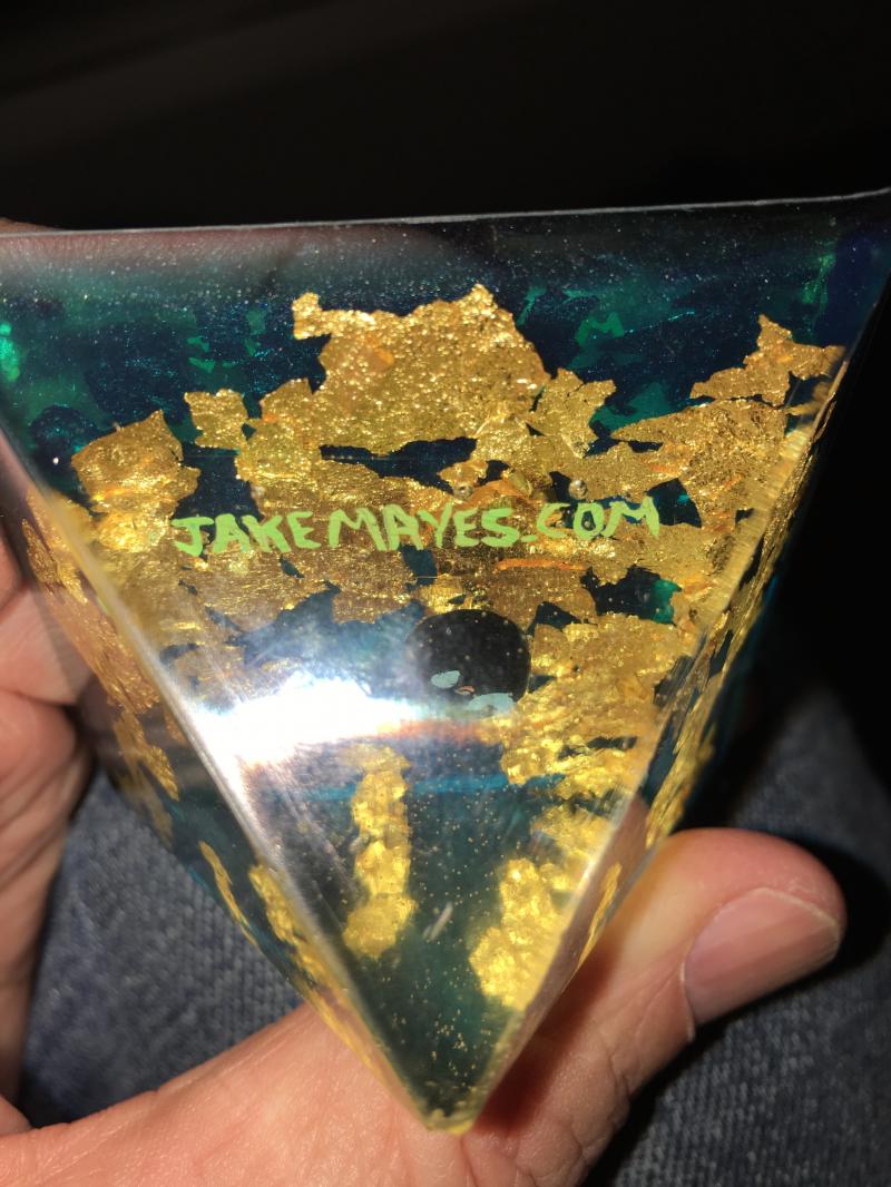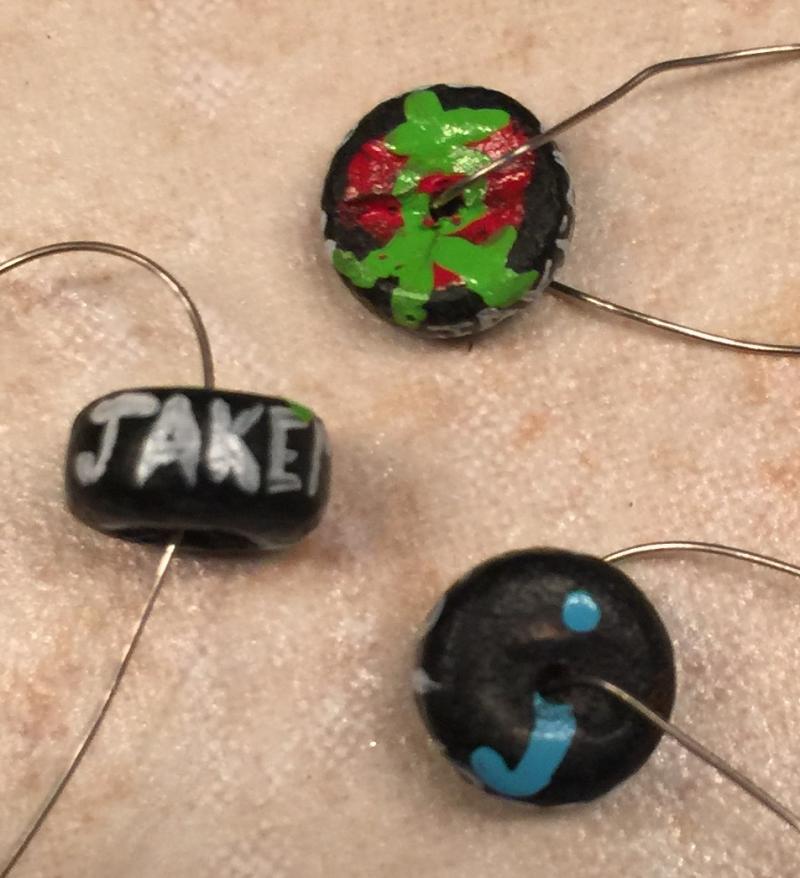 Here is the hand painted version of each bead. I painted along the edge jakemayes.com. On the back a semicolin which is a symbol for life going on, to be continued as a hope for those considering suicide. The there side is a red heart with the chinese symbol for Greif in the middle.